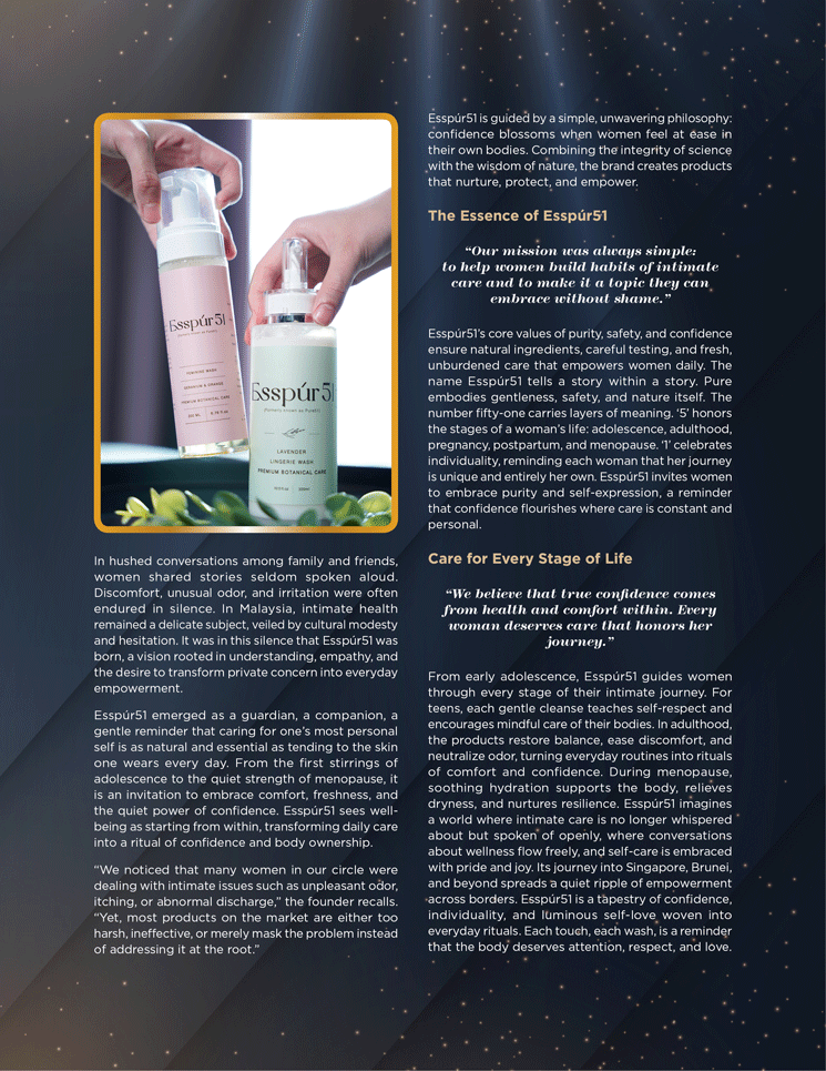 From early adolescence, Esspúr51 guides women through every stage of their intimate journey. For teens, each gentle cleanse teaches self-respect and encourages mindful care of their bodies. In adulthood, the products restore balance, ease discomfort, and neutralize odor, turning everyday routines into rituals of comfort and confidence. During menopause, soothing hydration supports the body, relieves dryness, and nurtures resilience. Esspúr51 imagines a world where intimate care is no longer whispered about but spoken of openly, where conversations about wellness flow freely, and self-care is embraced with pride and joy. Its journey into Singapore, Brunei, and beyond spreads a quiet ripple of empowerment across borders. Esspúr51 is a tapestry of confidence, individuality, and luminous self-love woven into everyday rituals. Each touch, each wash, is a reminder that the body deserves attention, respect, and love.
