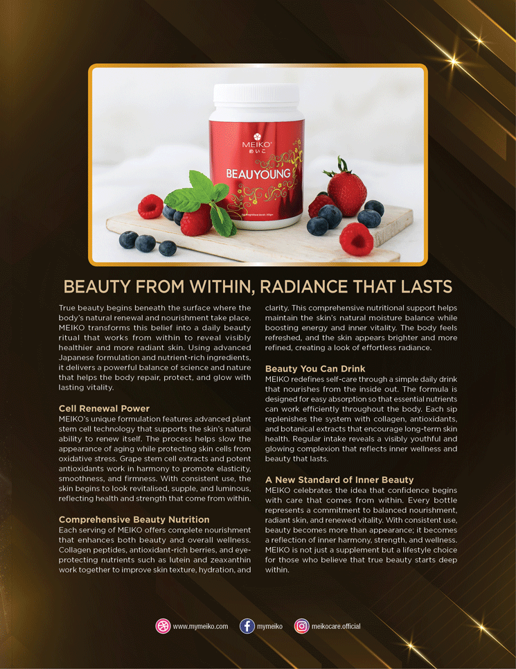 MEIKO celebrates the idea that confidence begins with care that comes from within. Every bottle represents a commitment to balanced nourishment, radiant skin, and renewed vitality. With consistent use, beauty becomes more than appearance; it becomes a reflection of inner harmony, strength, and wellness. MEIKO is not just a supplement but a lifestyle choice for those who believe that true beauty starts deep within.