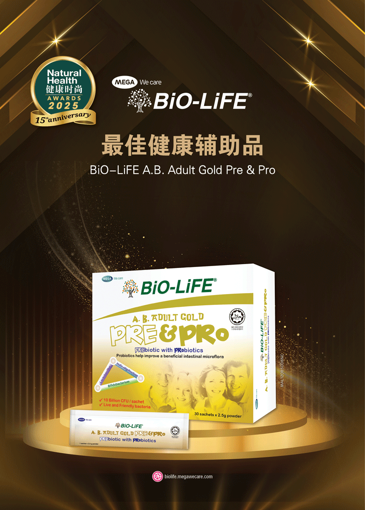 BiO-LiFE A.B. Adult Gold Pre & Pro 结合两种具科学测试的益生菌菌株——Lactobacillus plantarum LP01 与 Bifidobacterium lactis BB12,并搭配益生元菊粉和低聚果糖混合物,此精心配方有助支持肠道健康,改善肠道有益菌群。