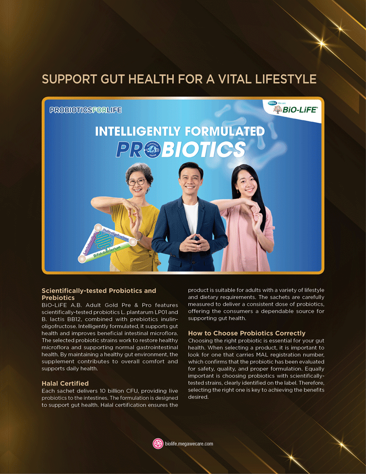 每一包 BiO-LiFE A.B. Adult Gold Pre & Pro 为肠道提供 100 亿 CFU 活性益生菌,此配方有助支持肠道健康。已通过 Halal 清真认证,适合不同生活型态与饮食需求的成年人服用。独立包装设计确保每次服用的摄取剂量精准一致,为消费者提供稳定可靠的肠道健康支持来源。