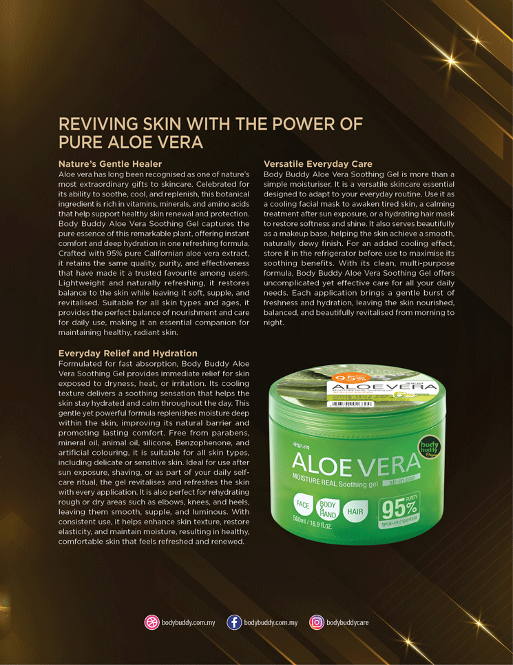 Aloe vera has long been recognised as one of nature’s most extraordinary gifts to skincare. Celebrated for its ability to soothe, cool, and replenish, this botanical ingredient is rich in vitamins, minerals, and amino acids that help support healthy skin renewal and protection. Body Buddy Aloe Vera Soothing Gel captures the pure essence of this remarkable plant, offering instant comfort and deep hydration in one refreshing formula. Crafted with 95% pure Californian aloe vera extract, it retains the same quality, purity, and effectiveness that have made it a trusted favourite among users. Lightweight and naturally refreshing, it restores balance to the skin while leaving it soft, supple, and revitalised. Suitable for all skin types and ages, it provides the perfect balance of nourishment and care for daily use, making it an essential companion for maintaining healthy, radiant skin.