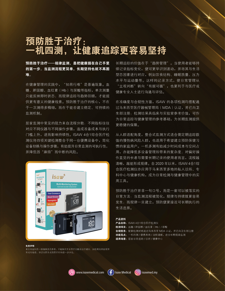 从人群适配角度,整合式监测方式适合需定期追踪数值的慢性病风险人群,也适用于希望建立预防保健习惯的家庭用户。一机多测有助减少时间成本与空间占用,亦能降低多设备管理所带来的复杂度;对偏好操作直觉的长者与需要长期记录的使用者而言,流程越清晰,越能形成规律。自 2020 年以来,ISAW 4合1综合医疗检测仪亦应用于马来西亚多地的私人诊所、专科中心与健康机构,成为日常检测与健康管理中的实用工具。