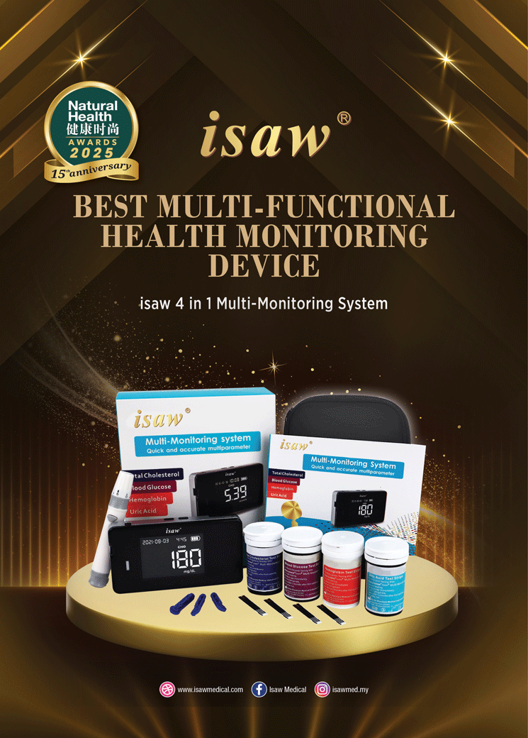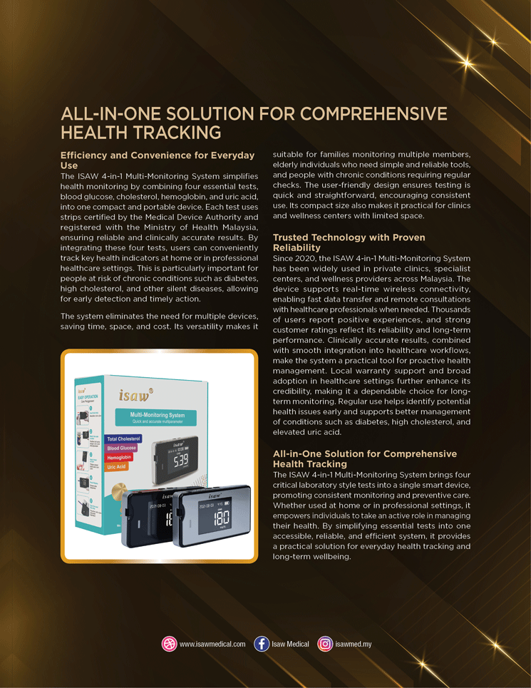 The ISAW 4-in-1 Multi-Monitoring System simplifies health monitoring by combining four essential tests, blood glucose, cholesterol, hemoglobin, and uric acid, into one compact and portable device. Each test uses strips certified by the Medical Device Authority and registered with the Ministry of Health Malaysia, ensuring reliable and clinically accurate results. By integrating these four tests, users can conveniently track key health indicators at home or in professional healthcare settings. This is particularly important for people at risk of chronic conditions such as diabetes, high cholesterol, and other silent diseases, allowing for early detection and timely action.