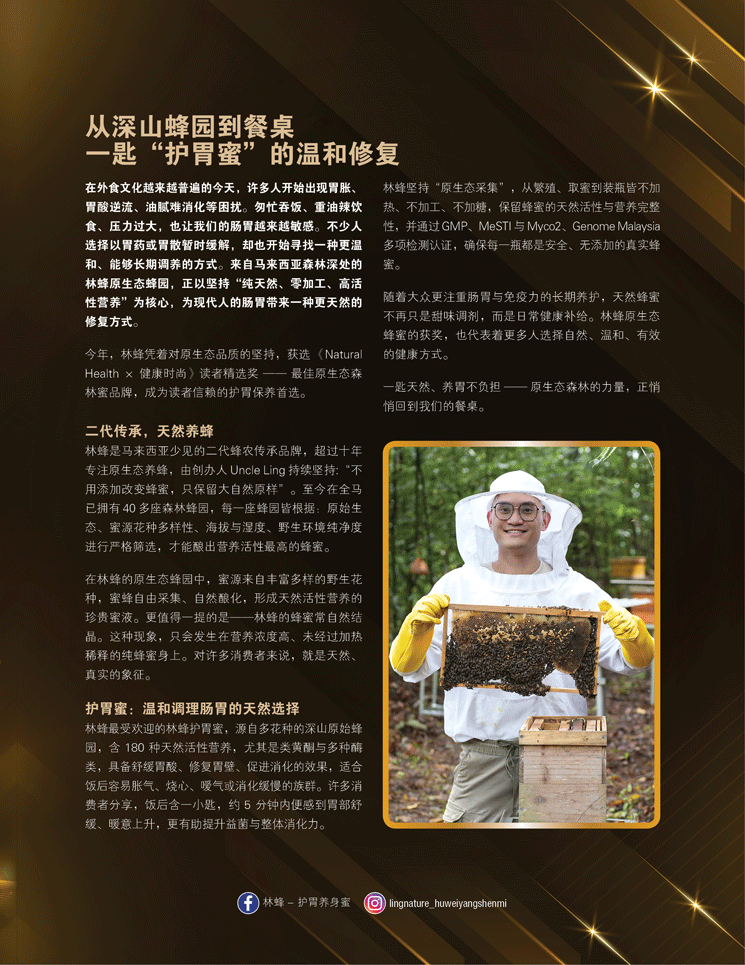今年,林蜂凭着对原生态品质的坚持,获选 《Natural Health × 健康时尚》读者精选奖 —— 最佳原生态森林蜜品牌,成为读者信赖的护胃保养首选。