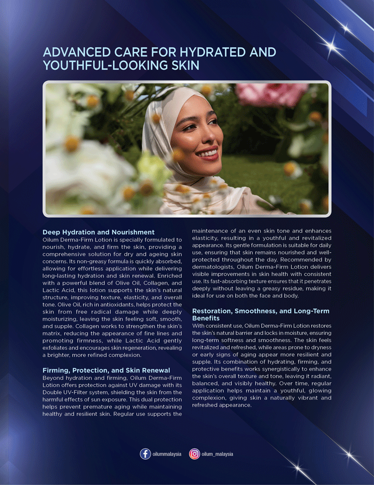 With consistent use, Oilum Derma-Firm Lotion restores the skin’s natural barrier and locks in moisture, ensuring long-term softness and smoothness. The skin feels revitalized and refreshed, while areas prone to dryness or early signs of aging appear more resilient and supple. Its combination of hydrating, firming, and protective benefits works synergistically to enhance the skin’s overall texture and tone, leaving it radiant, balanced, and visibly healthy. Over time, regular application helps maintain a youthful, glowing complexion, giving skin a naturally vibrant and refreshed appearance.