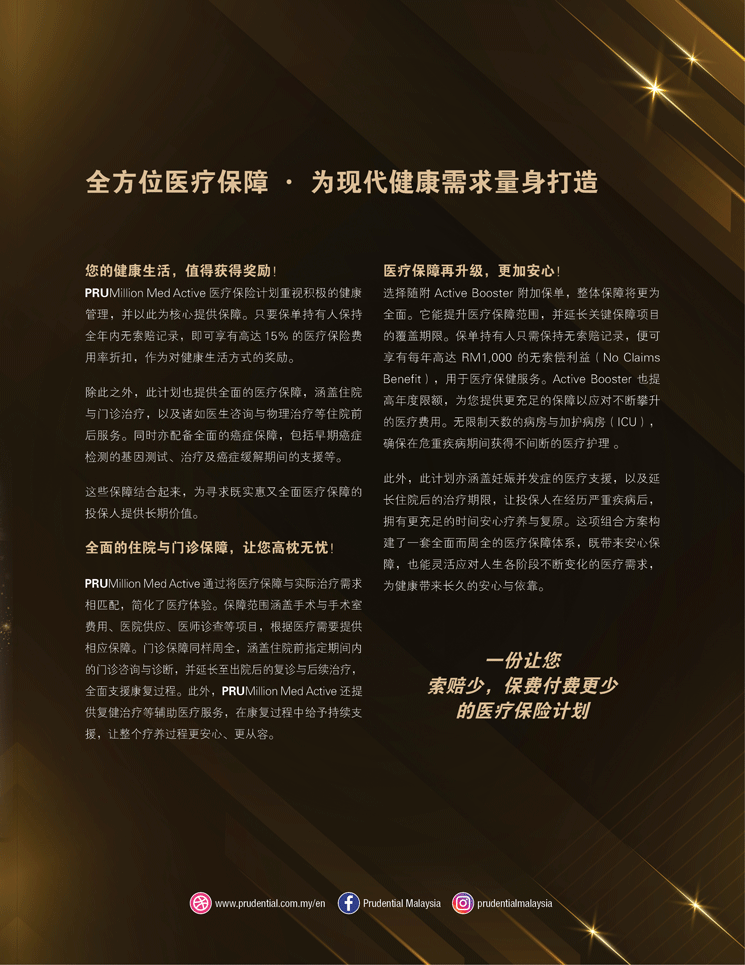 PRUMillion Med Active 医疗保险计划重视积极的健康管理,并以此为核心提供保障。只要保单持有人保持全年内无索赔记录,即可享有高达 15% 的医疗保险费用率折扣,作为对健康生活方式的奖励。