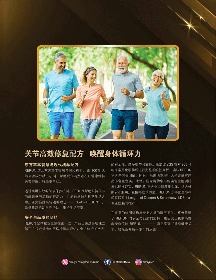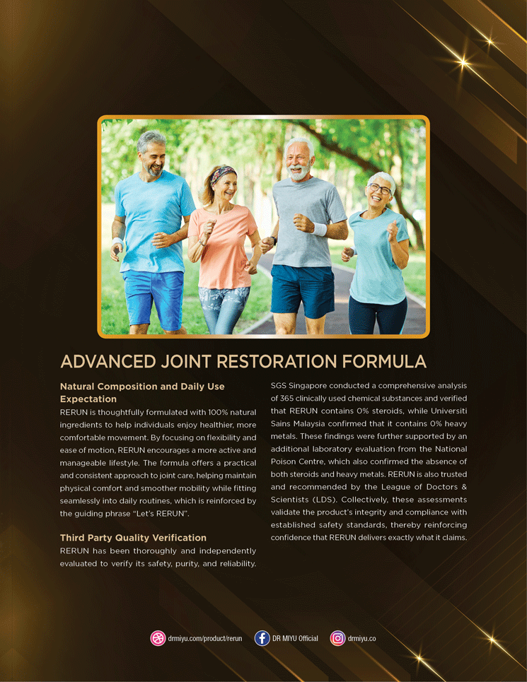的安全性、纯净度与可靠性。新加坡 SGS 针对 365 种临床常用化学物质进行完整系统性分析,确认 RERUN 不含任何类固醇;同时,马来西亚理科大学亦证实产品不含重金属。此外,国家毒物中心的实验室检测结果也同样证实,RERUN 不含类固醇及重金属,适合长期安心服用。更值得信赖的是,RERUN 获得医生与科学家联盟(League of Doctors & Scientists,LDS)的专业信赖与推荐!