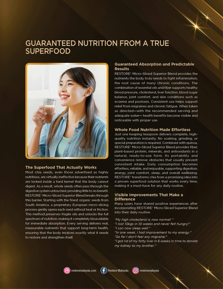 Just one heaping teaspoon delivers complete, high-quality nutrition instantly. No soaking, grinding, or special preparation is required. Combined with quinoa, RESTORE® Micro-Sliced Superior Blend provides fiber, plant-based protein, minerals, and antioxidants in a natural, ready-to-use form. Its portability and convenience remove obstacles that usually prevent consistent intake. Daily consumption becomes effortless, reliable, and enjoyable, supporting digestion, energy, joint comfort, sleep, and overall wellbeing. RESTORE® transforms chia from a promising idea into a proven superfood solution that works every time, making it a must-have for any daily routine.