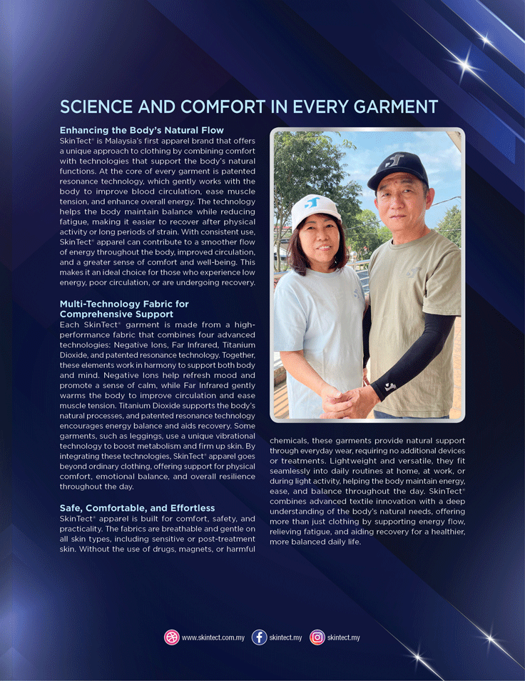 SkinTect® is Malaysia’s first apparel brand that offers a unique approach to clothing by combining comfort with technologies that support the body’s natural functions. At the core of every garment is patented resonance technology, which gently works with the body to improve blood circulation, ease muscle tension, and enhance overall energy. The technology helps the body maintain balance while reducing fatigue, making it easier to recover after physical activity or long periods of strain. With consistent use, SkinTect® apparel can contribute to a smoother flow of energy throughout the body, improved circulation, and a greater sense of comfort and well-being. This makes it an ideal choice for those who experience low energy, poor circulation, or are undergoing recovery.