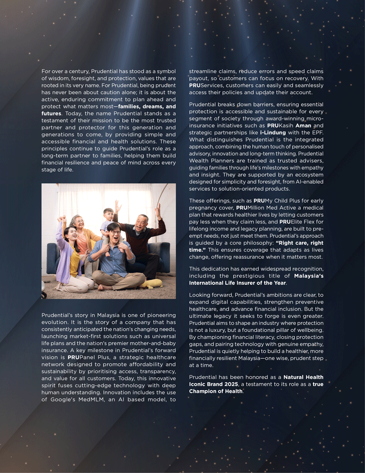 Looking forward, Prudential’s ambitions are clear, to expand digital capabilities, strengthen preventive healthcare, and advance financial inclusion. But the ultimate legacy it seeks to forge is even greater. Prudential aims to shape an industry where protection is not a luxury, but a foundational pillar of wellbeing. By championing financial literacy, closing protection gaps, and pairing technology with genuine empathy, Prudential is quietly helping to build a healthier, more financially resilient Malaysia—one wise, prudent step at a time.